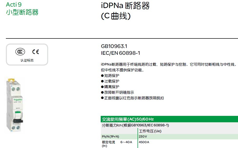 iDPNa,小型断路器,施耐德,Acti9,低压配电,MCB,4.5KA