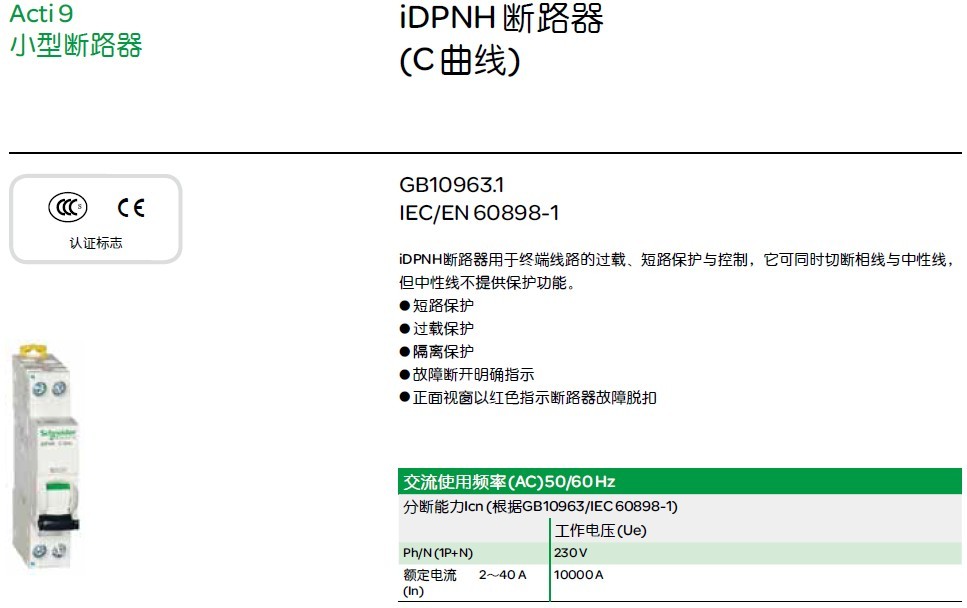 iDPNH,小型断路器,施耐德,Acti9,低压配电,MCB,10KA